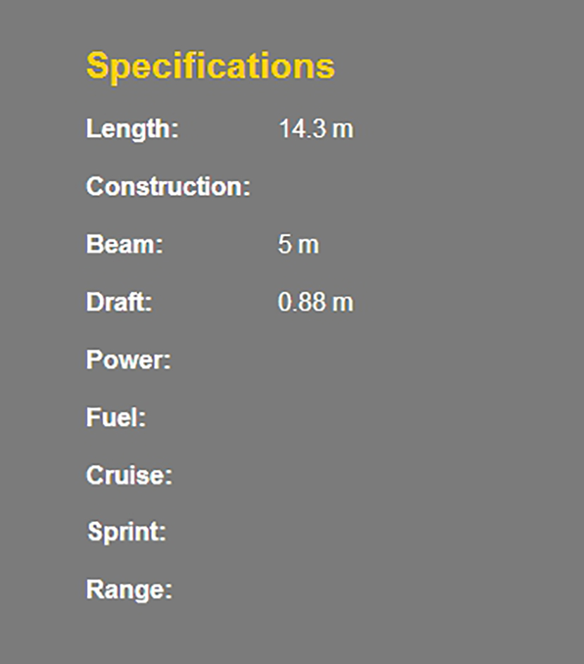 | 總長(zhǎng): | 14.3m | 型寬: | 5m |