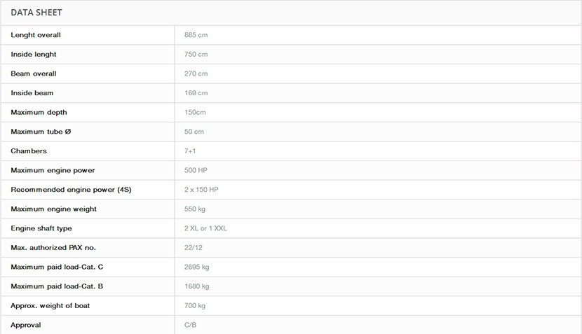 | 總長: | 8.85m | 總重量: | 700kg |