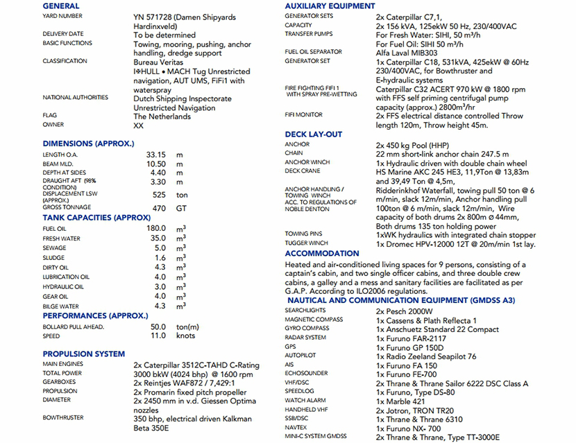 | 發電機組: | 2×Caterpilar 3512C-TAHD C-Rating | 齒輪箱: | 2×Reintjes WAF 872 |