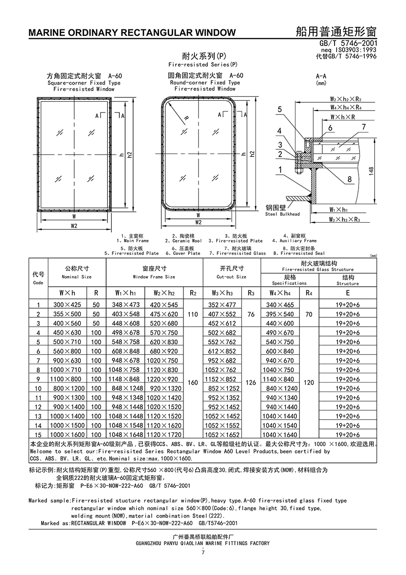 船用圓角固定式耐火窗