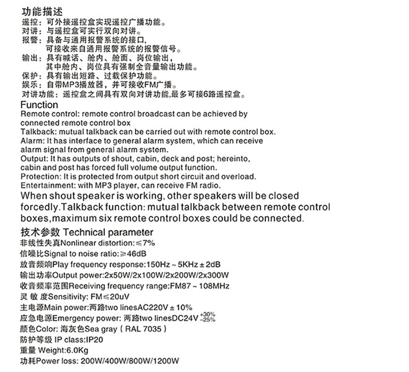 | 頻率: | FM87~108MHz | 重量: | 6.0Kg |