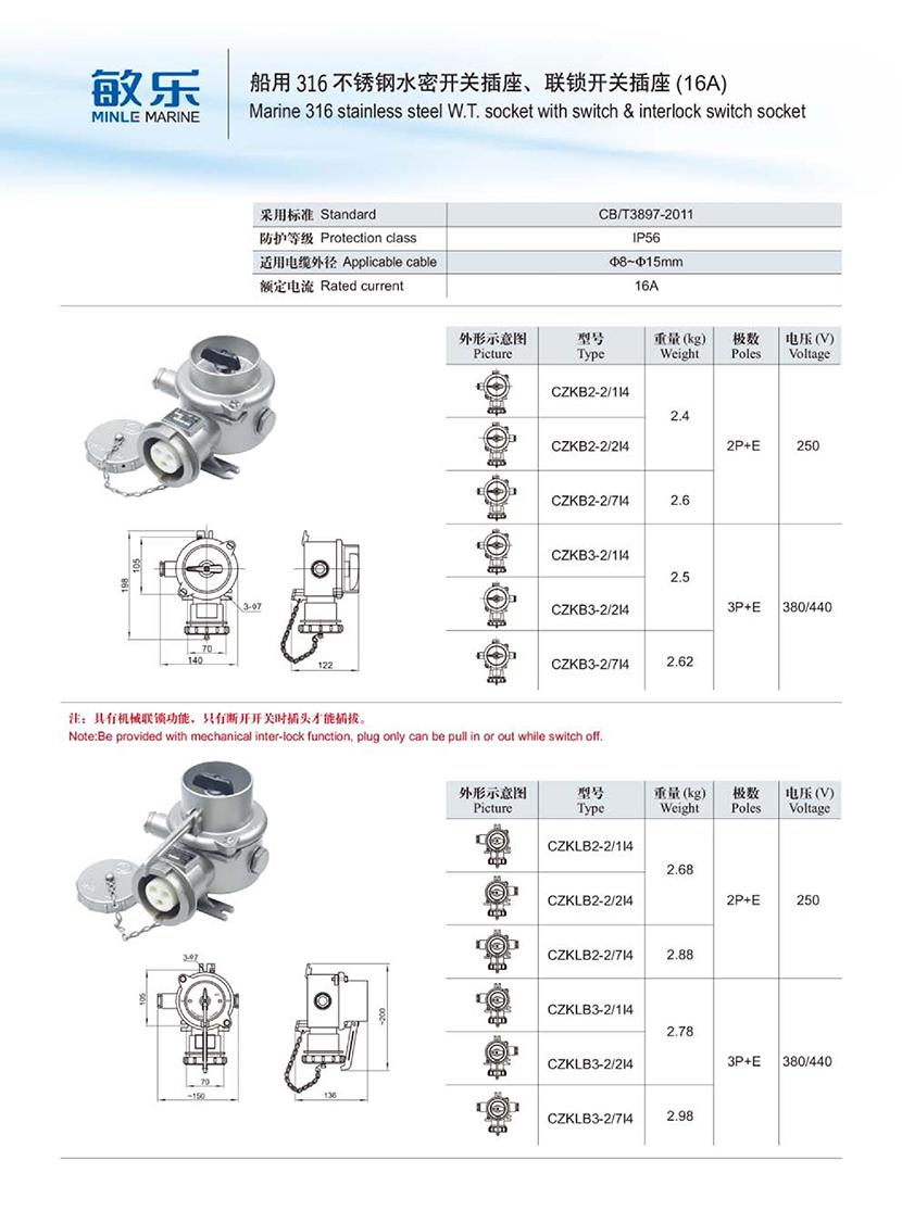 | 船用316不銹鋼水密聯(lián)鎖開(kāi)關(guān)插座(16A) | |||