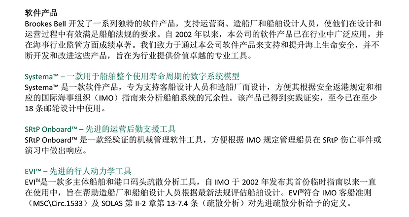 | 應(yīng)用目的: | 支持和提升海上生命安全;幫助船舶設(shè)計(jì)符合“安全返港”要求 | 功能亮點(diǎn): | Systema? 可模擬新造船系統(tǒng)并具體到組件層次,從而評(píng)估船舶設(shè)計(jì)是否符合“安全返港”要求;SRtP Onboard?可與Systema?配合,模擬船上系統(tǒng),指引船員依照“安全返港”要求在傷亡事故演戲中進(jìn)行操作與行動(dòng);EVI?可以模擬船上乘客撤離疏散實(shí)況,評(píng)估船舶當(dāng)前設(shè)計(jì)是否符合疏散要求,并高亮注明擁堵位置,為設(shè)計(jì)階段優(yōu)化全船布局提供參考。 |